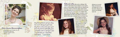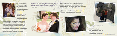 The Accordion Fold Tribute is the premier piece for remembering your loved one. Featuring your own text (restricted to certain word counts), and nine photographs of your loved one, the Accordion Fold Tribute tells the story of your loved one's life. The piece folds down into four 4½" x 5½" panels, and is printed on 80lb cardstock. This piece fits into a standard A2 envelope. (Envelopes not included.)